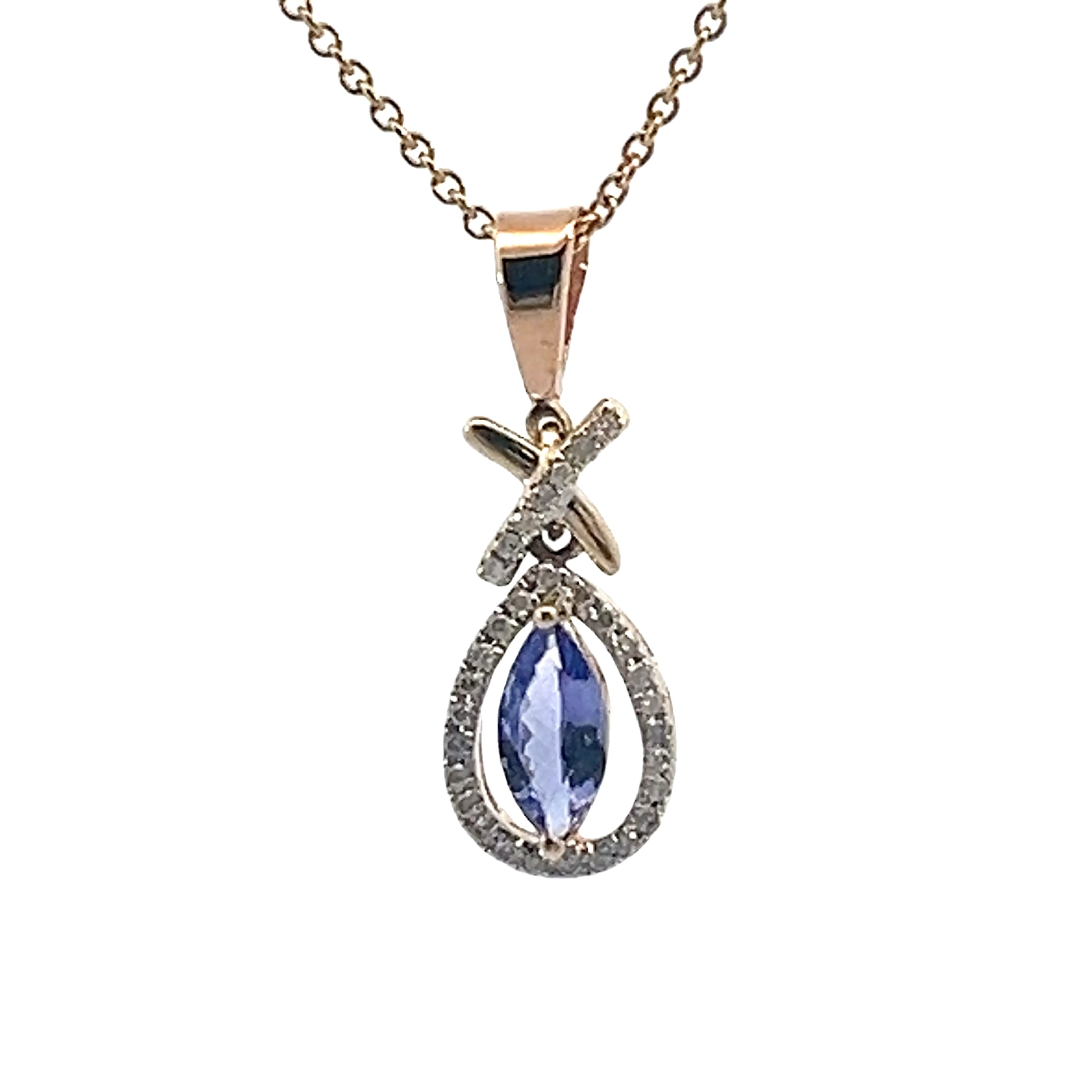 This stunning pendant features a captivating tanzanite gemstone, elegantly set in a delicate gold design. The intricate detailing and shimmering accents make it a perfect accessory for any occasion, adding a touch of sophistication to your outfit.