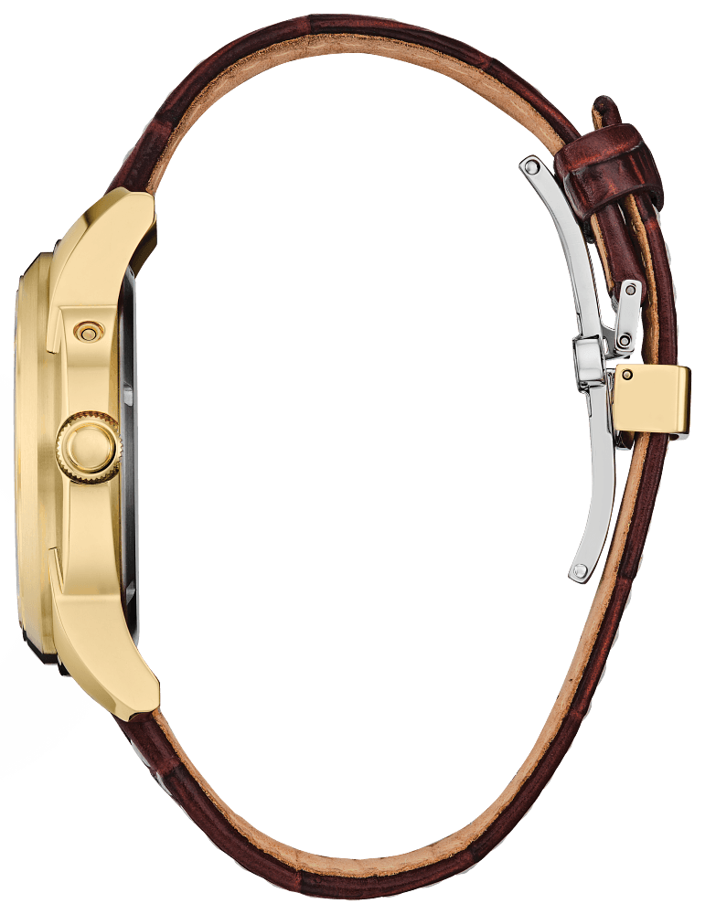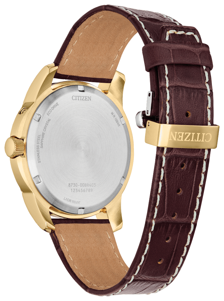 Bring sophistication to your day with the new Calendrier timepiece. Avant-garde in style, the future-focused timepiece wears 41.8mm on the wrist in gold-tone stainless steel. A recessed crown and brown leather strap add to its distinction. On the multi-dimensional dial, the watch features analog indicators for the month, day, and date, as well as a moonphase indicator towards the 6 o’clock position, as tones of a rich cream, silver, and gold add to the dial’s charm. The watch features Citizen’s Eco-Drive technology – sustainably powered by light, any light, and never needs a battery. Water resistant to 100 meters. Caliber 8730.