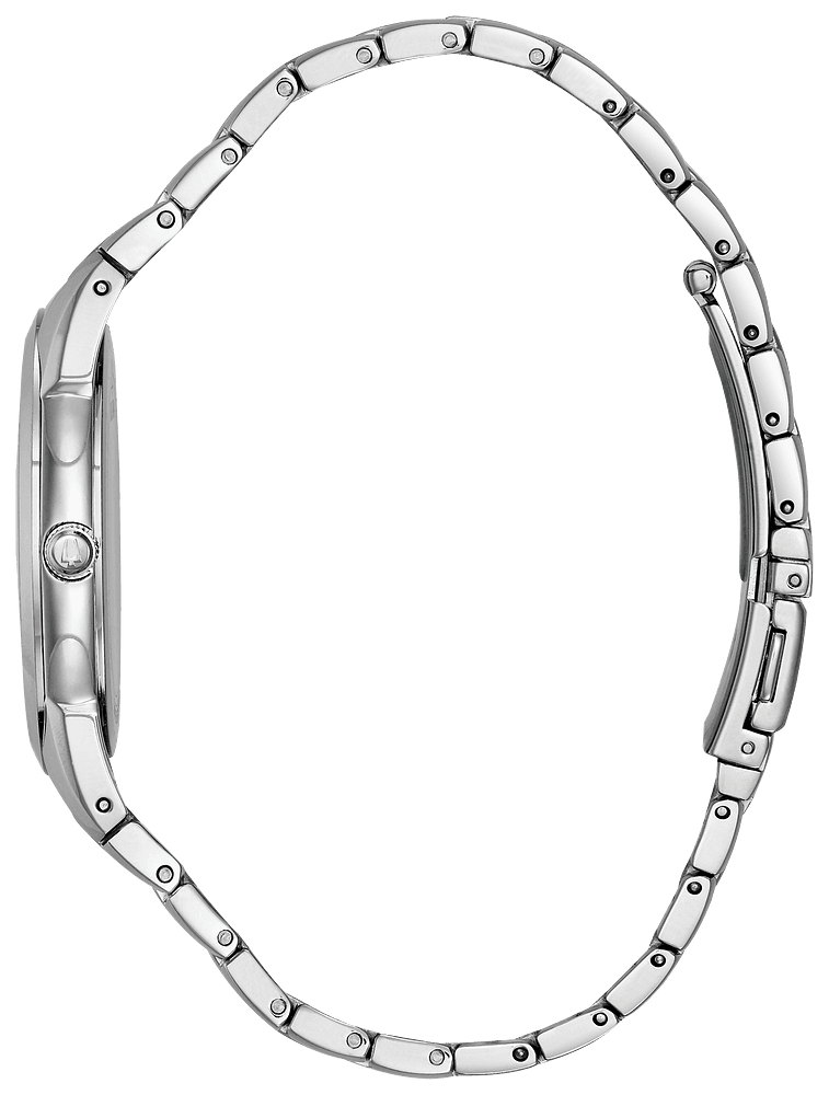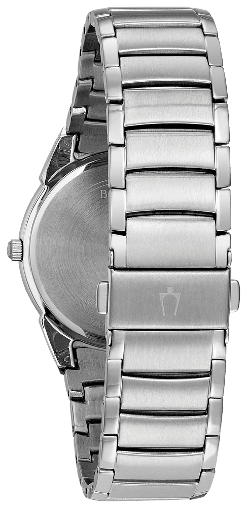 From the Classic Collection. In stainless steel with domed crystal, patterned black dial, calendar, second hand, and secure double-press fold-over clasp.