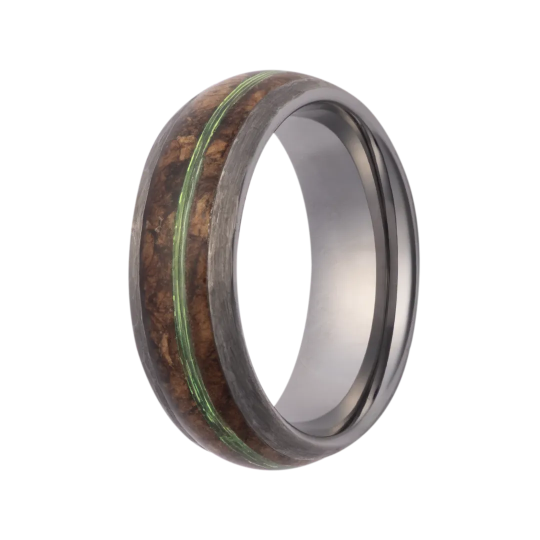 This 8MM, domed, tungsten men’s wedding ring from our Fishing Line Collection features a 2MM inlay cork and 1MM neon green fishing line center, with a rugged hammer finish. Comfort fit for easy, all-day wear