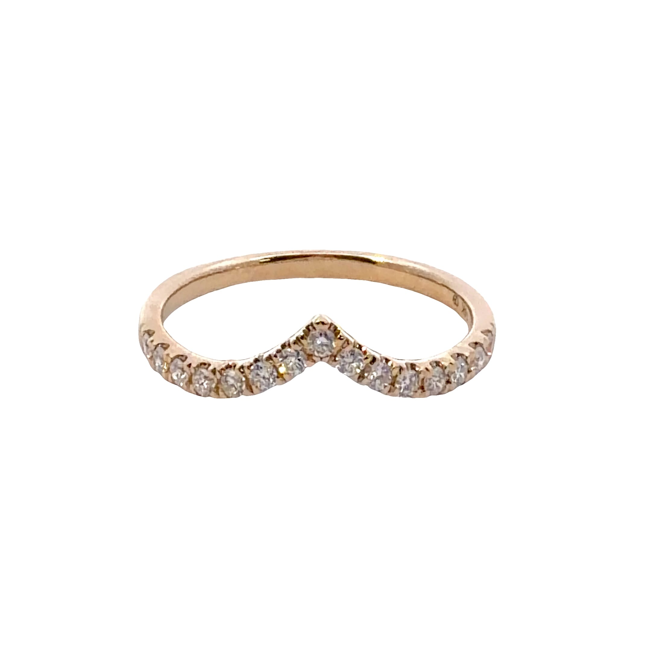 An elegant yellow gold chevron wedding ring featuring a series of round brilliant cut diamonds. The diamonds are meticulously set in a shared-prong arrangement along the V-shaped band, highlighting the sharp symmetry and high polish finish of the setting. This versatile piece is designed for seamless layering with wedding or fashion rings.