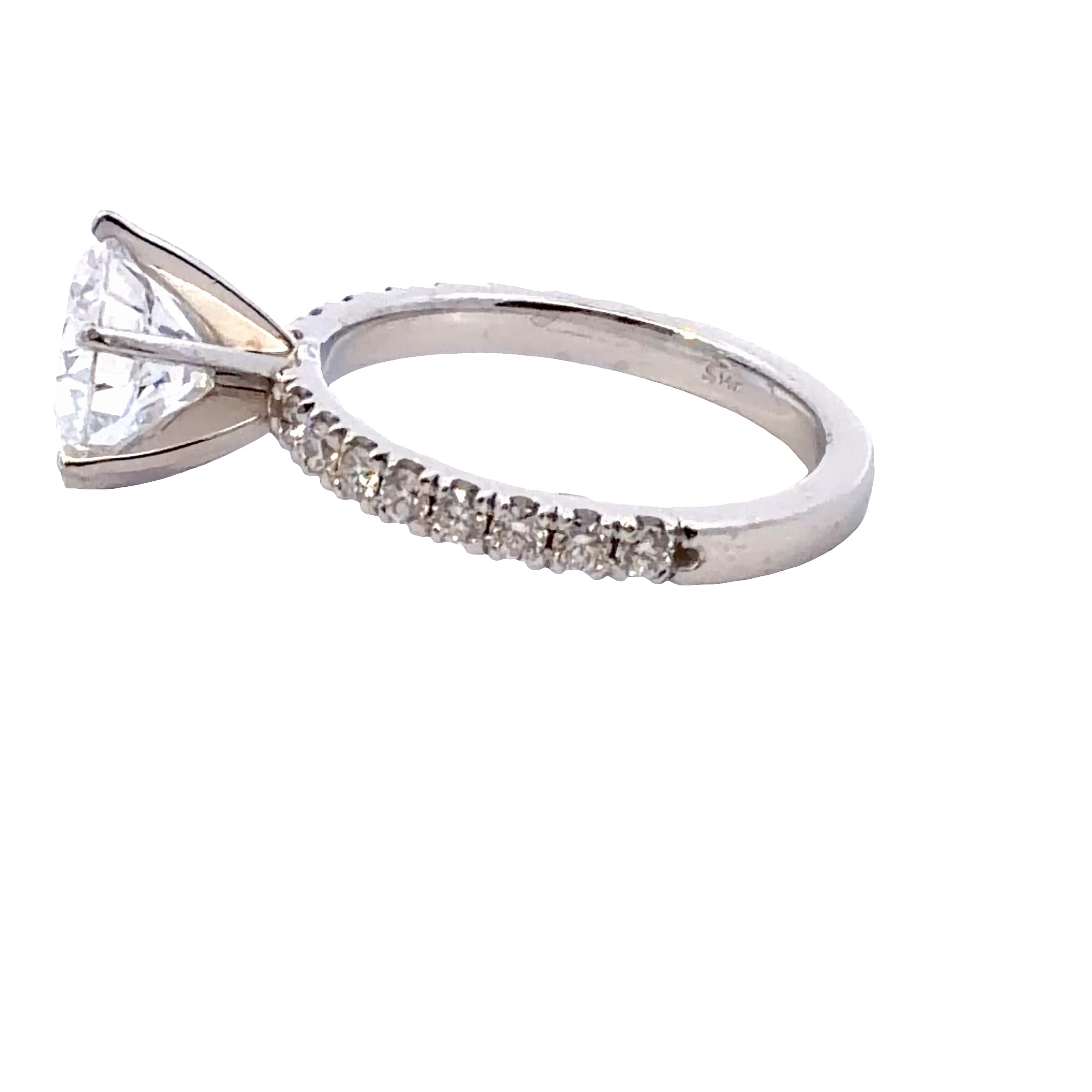 This is the perfect engagement ring mounting for the someone who loves a classic and elegant look. This ring is ready for a 2ct round diamond in the center and is currently shown with a CZ. Set in 14kt white gold and the shank is adorned with 3/8cttw of diamonds for that eye catching sparkle from every angle!