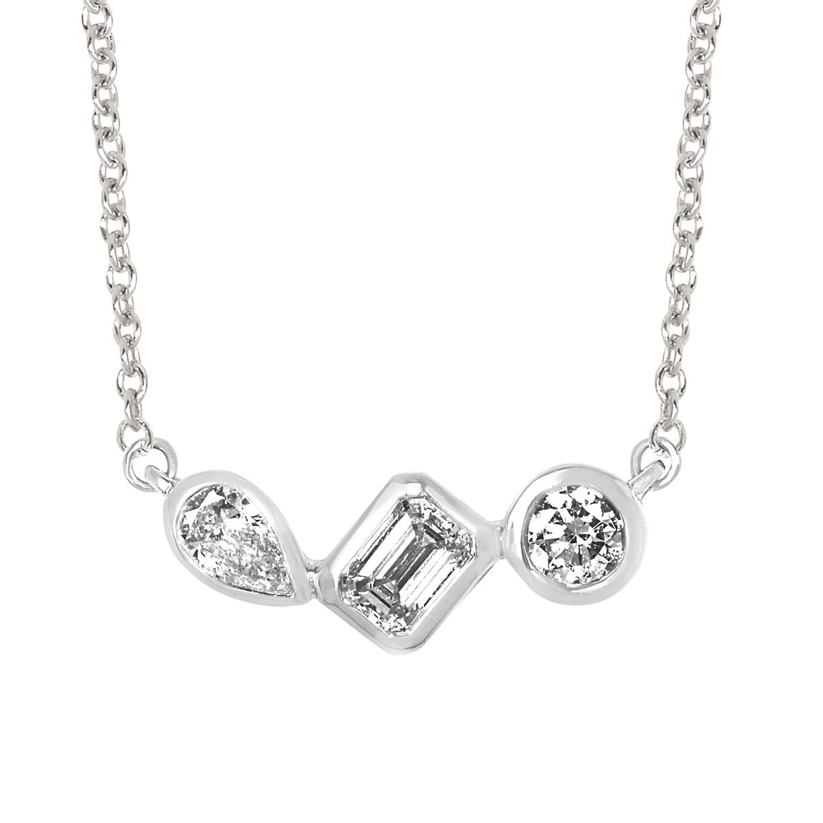 Round brilliant, emerald cut, and pear cut diamond bar necklace in sterling silver