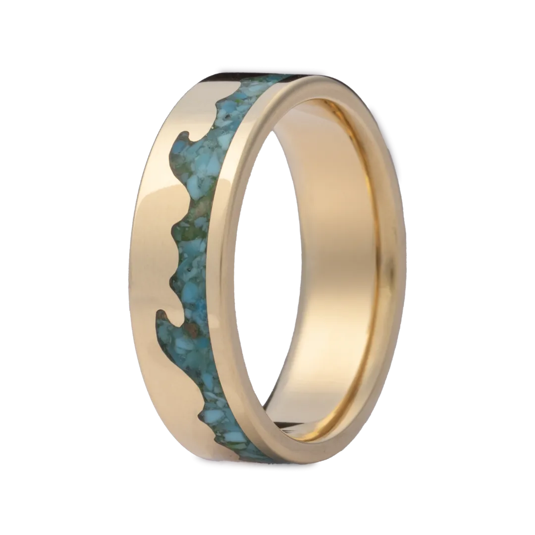 From our Recessed Landscapes Collection, this 6MM, 14 karat yellow gold, flat, high-polish band is milled to create a stunning ocean vista of vivid blue turquoise.