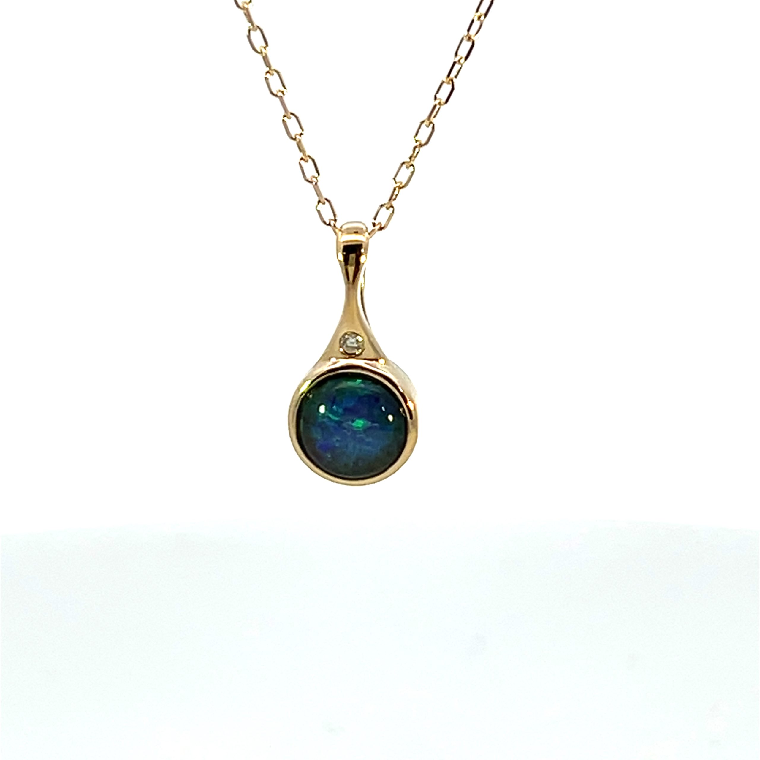 A gorgeous opal triplet set in 10kt yellow gold with a diamond accent. Its mesmerizing blue hues create a striking allure. A timeless piece exuding subtle sophistication, this necklace adds a touch of individuality to any ensemble.