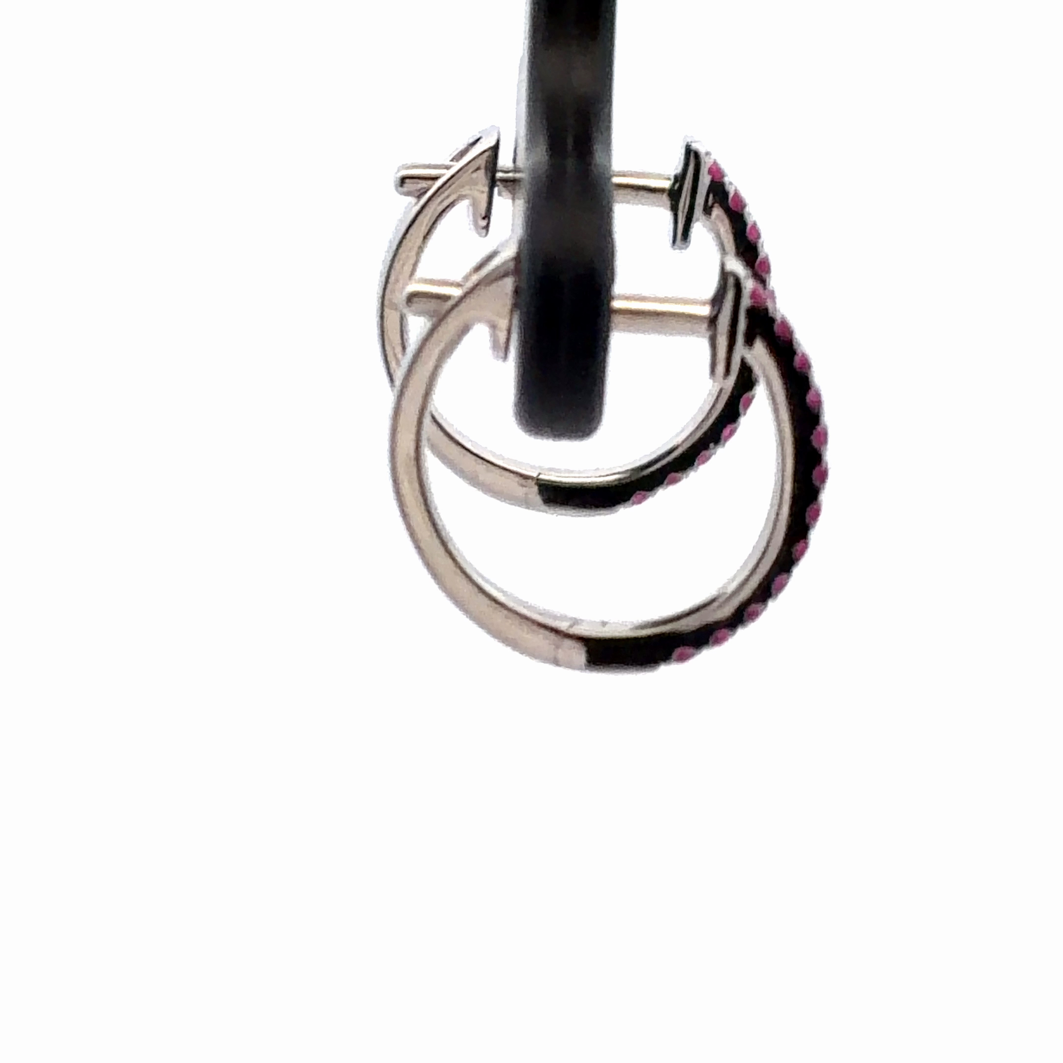 A continuous line of vibrant red rubies defines the front profile of these classic hoop earrings. The round stones are securely set in polished white gold, offering a striking contrast of rich color and bright metal.